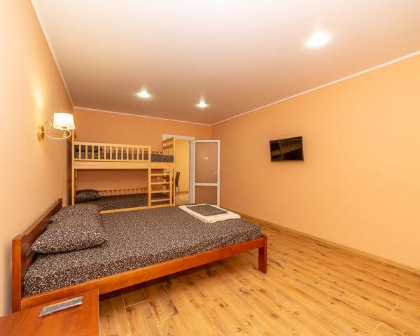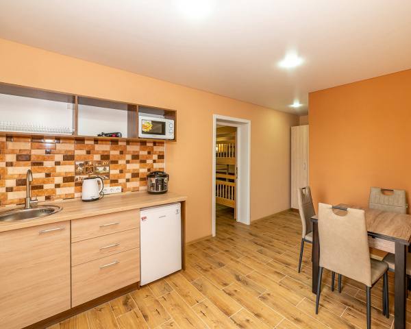- четырёхместный и пятиместный люкс с кухней (санузел, чайник, холодильник, кондиционер, мультиварка, микроволновая печка, посуда, постельное белье)